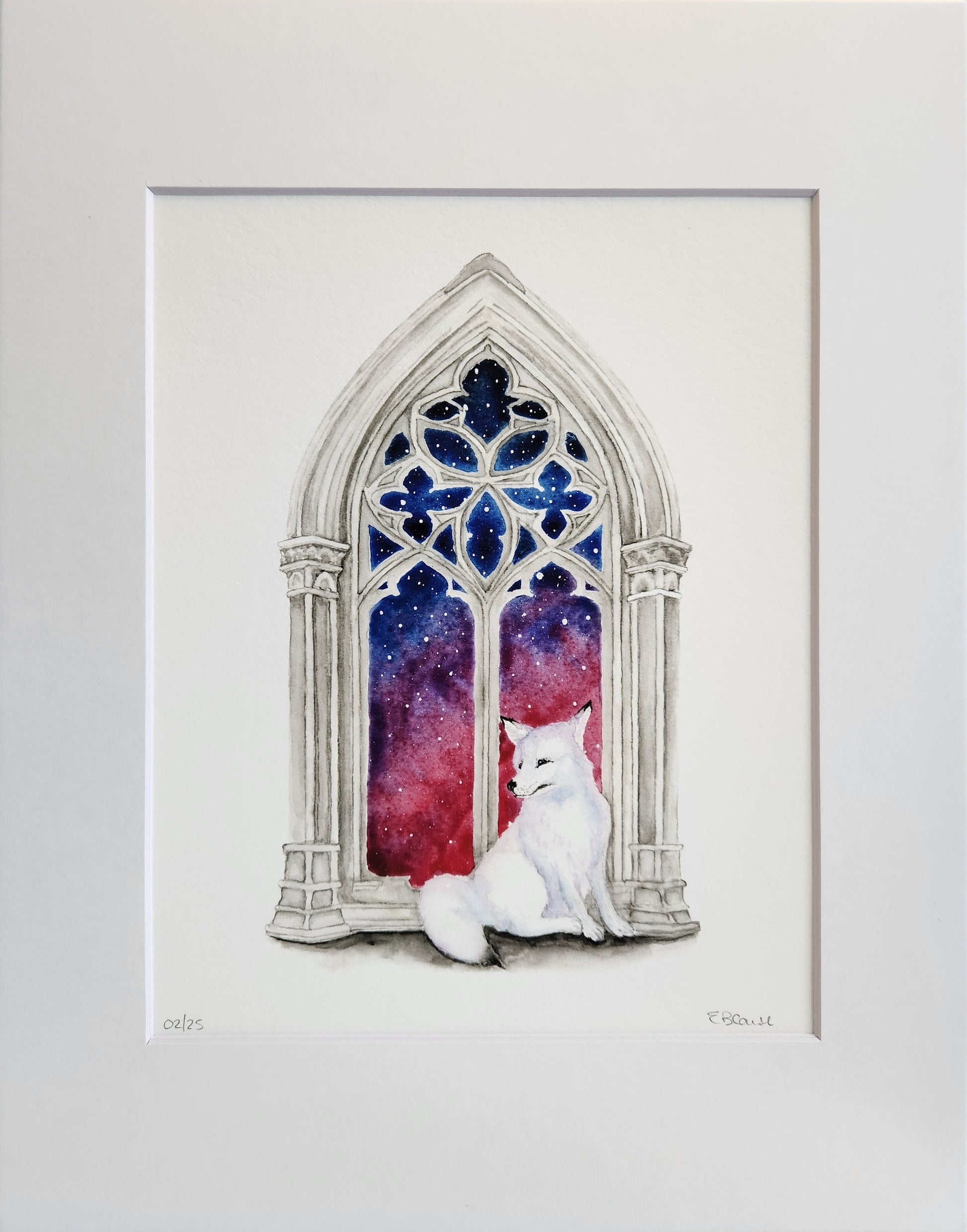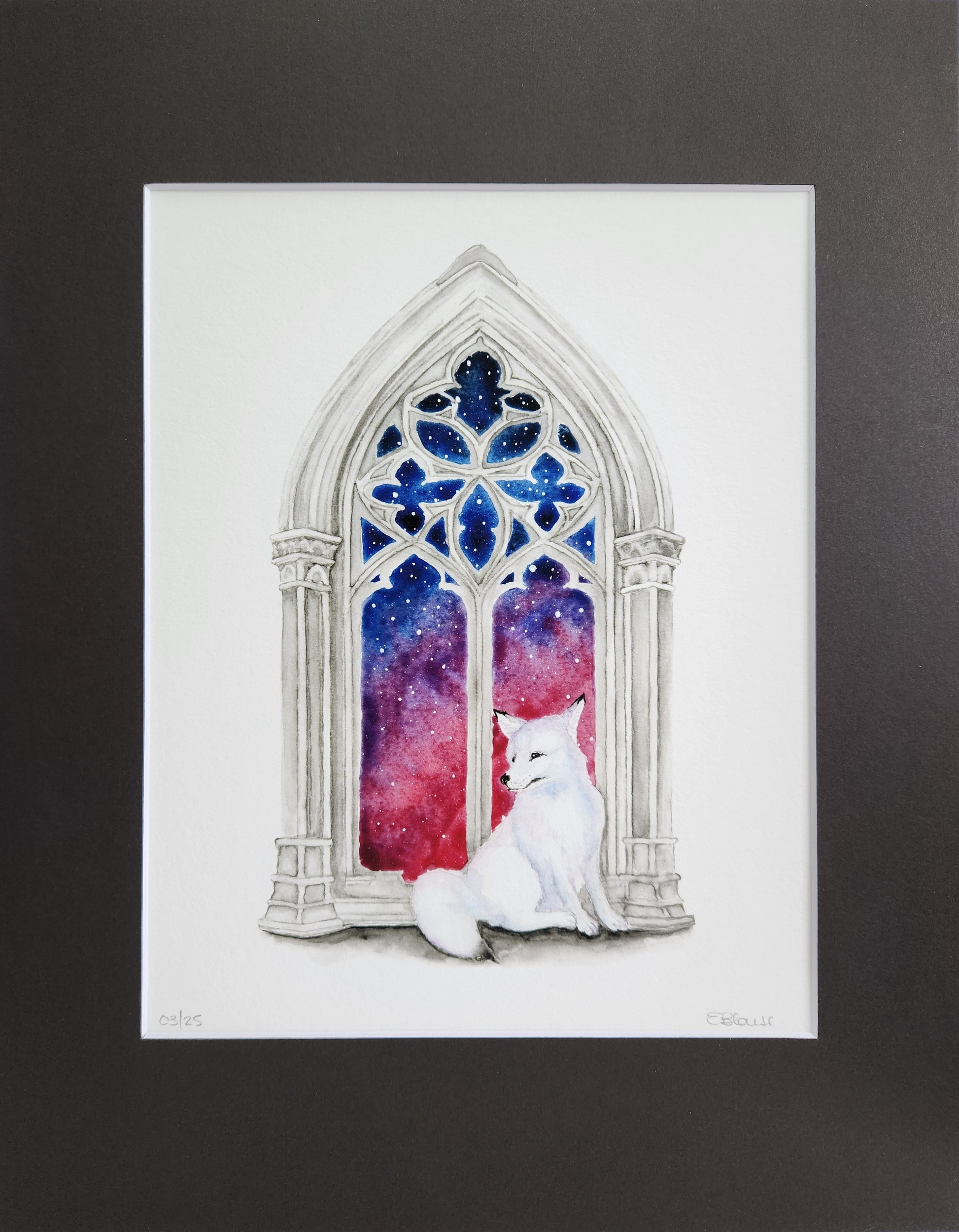 This fine art print is reproduced from an original watercolor painting inspired by nature, quiet magic, and the stories that linger long after the last page is turned. A white fox rests before a gothic arched window, gazing into a stained-glass night sky that blends deep blues, purples, and crimson—evoking both celestial wonder and introspective calm.